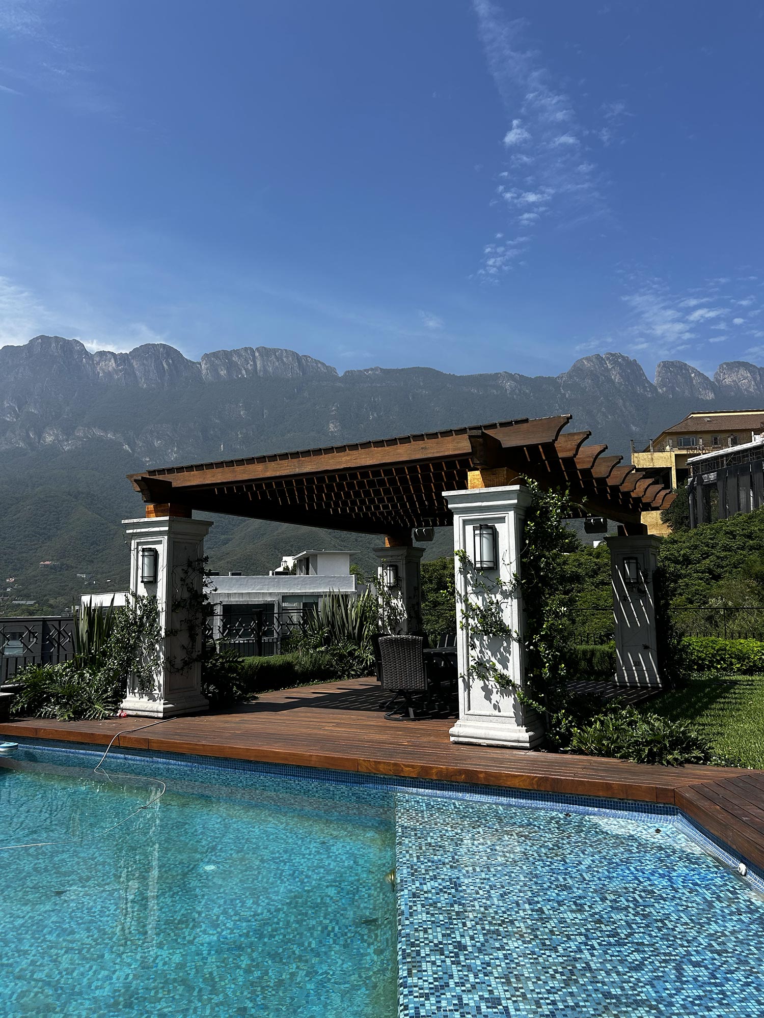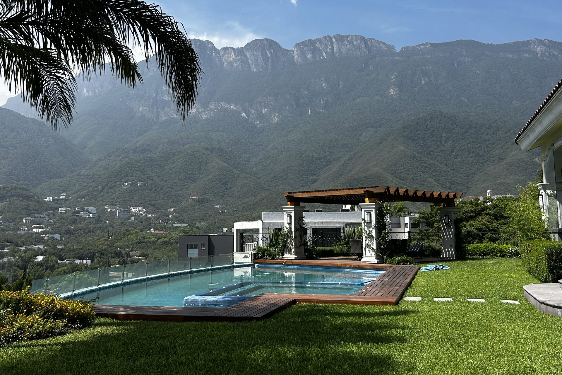 Alberca privada con vista elevada hacia la montaña, creando un ambiente tipo resort.