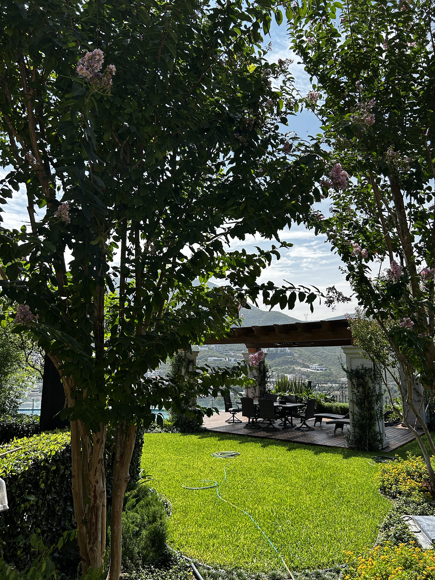 Terraza y área social exterior bajo pergolado, rodeadas de vegetación madura y vistas abiertas.